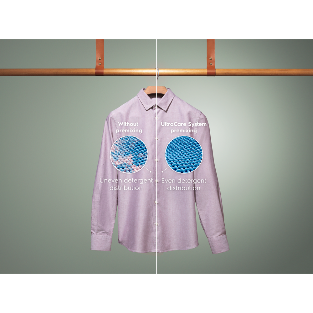 Το Σύστημα UltraCare προ-αναμιγνύει τα απορρυπαντικά για ένα γρήγορο, σχολαστικό καθάρισμα. Το προ-αναμεμιγμένο μαλακτικό φτάνει στην κάθε ίνα του υφάσματος και την προστατεύει.